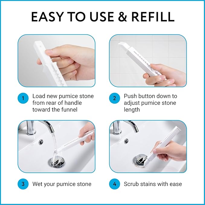 - Secure, Refillable Handle Design: Each thin pumice stick, measuring 0.5 x 7.75 inches, is equipped with a reinforced handle that locks the pumice chisel securely, ensuring no slipping during use; perfect for integrating into your toilet cleaner toolkit