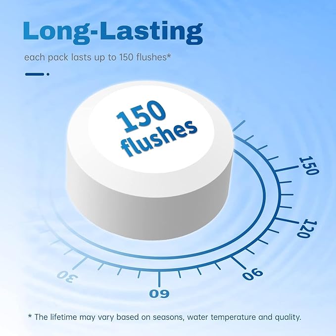 - LONG-LASTING EFFECT: With the sustained-release technology, each Vacplus splash toilet cleaner can continuously clean the toilet for up to 15 days with 20 flushes a day. With 80 packs for replacement, Vacplus toilet cleaner tablets can keep the toilet bowl clean and fresh for over 40 months. Additionally, the lifetime of each toilet tablet may vary with the frequency of flushes.