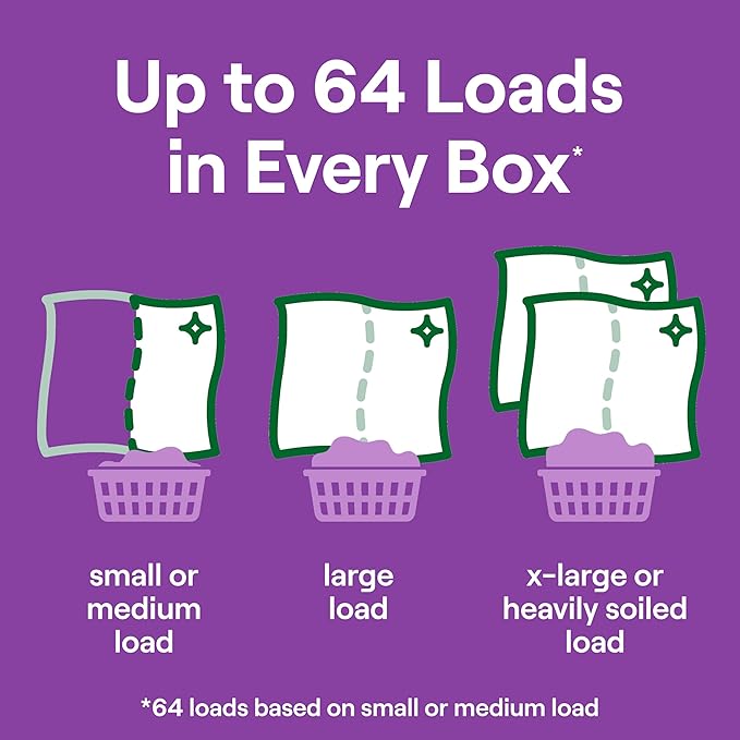 - CONVENIENT CLEAN: Just toss into your washer, load your laundry, and go! No more heavy, messy laundry jugs. Up to 64 loads. ½ sheet = 1 small or medium load. 1 sheet = 1 large load. 2 sheets = 1 extra-large or heavily soiled load. (Read Label before use)