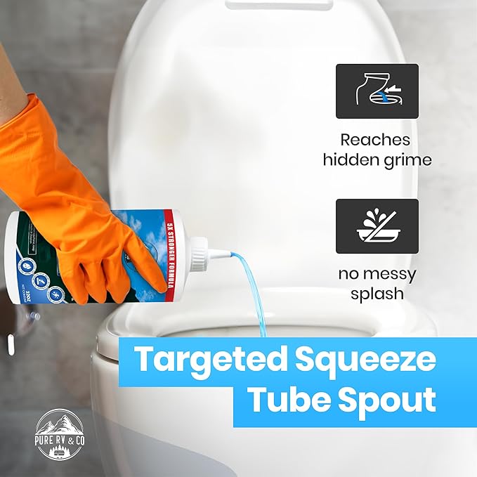 - EASY-USE SQUIRT TOP FOR QUICK APPLICATION - Our no-mess squirt-top bottle allows for controlled, precise application under the toilet bowl rim, no mixing or measuring required. Just squirt, let it sit, brush, and flush. Ideal for regular maintenance while on the road or at campgrounds, it a rv must haves, and rv essential.