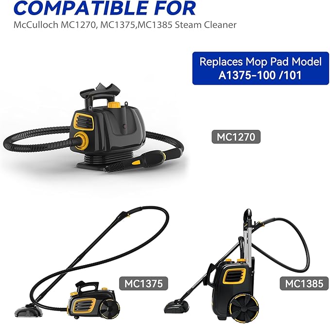 - Replacement Steam mop refills compatible for McCulloch MC1375, MC1385, MC1270 Steam Cleaner. Replaces Mop Pad Model A1375-100 Traditional Soft pads and A1375-101 Scrubbing pads.