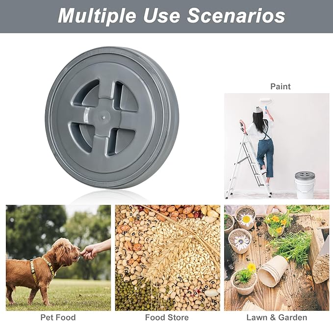 - Multi Use- these 5 gallon bucket lid can be widely applied in buckets, storage buckets, paint buckets, fishing, chemical buckets and plastic buckets, car wash buckets etc. This bucket lid turns any standard plastic bucket into a good sealing pet food storage container.