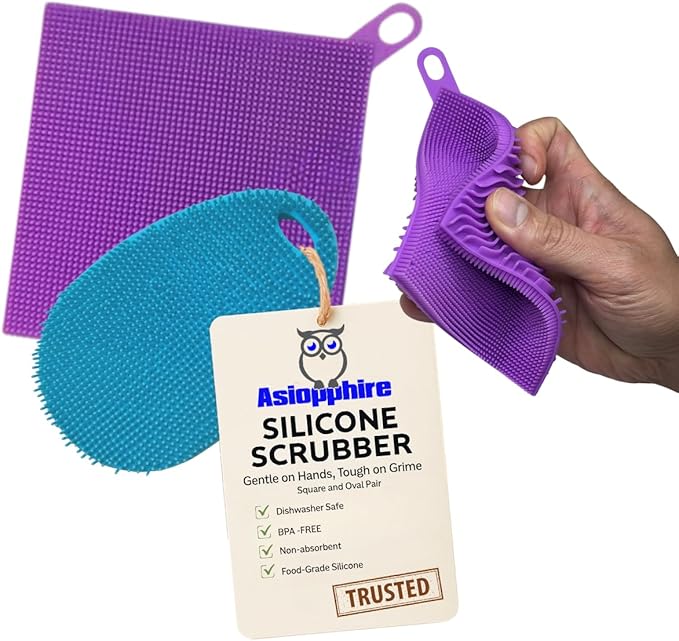 - At Asiopphire, we're committed to creating the durable, efficient home & dish washing accessories you need for a clean, sustainable home. We use our silicone scrubber dish sponges in our own home, testing for long-lasting quality and functionality. When our customers are happy, we're happy - which is why we back our silicone kitchen scrubbers for dishes with our customer happiness promise. If for any reason you don't love your sponge, we will make it right.