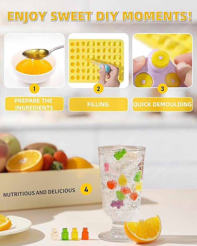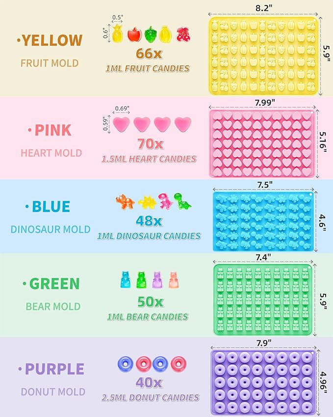 - 5 SHAPES CANDY MAKING SET: The gummy molds includes bears, dinosaurs, donuts, hearts and fruit. Comes with 2 droppers of 5ml and 1 clean brush. Whether it's a birthday party, a holiday celebration, or just a fun family activity, the diverse shapes inspire limitless creativity.