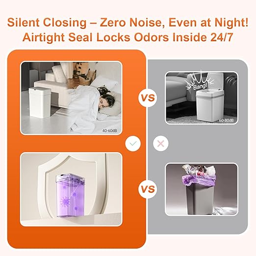 - Quiet Seal-Tight Closure & Odor Control:Smooth, low-noise lid closes at conversational volume (quieter than a refrigerator hum) with airtight seal technology. The fully enclosed design blocks 90% of odor particles* and reduces bacterial growth by preventing airflow—ideal for diapers or kitchen food waste.