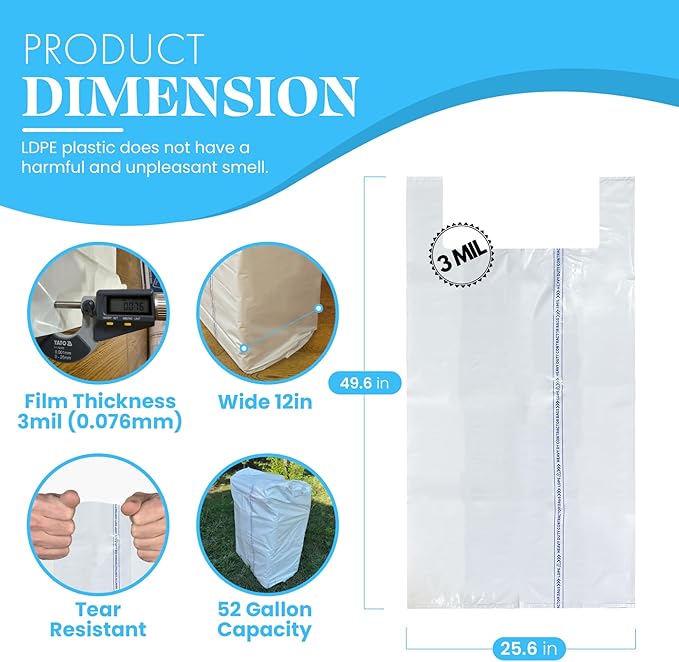 - Extra Large Capacity: With a generous 52-gallon capacity and dimensions of 49.6 x 25.6 inches, these large trash bags are ideal for big trash bags jobs like home renovations, outdoor cleanups, and landscaping.