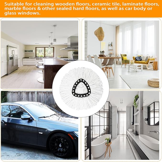 - Multi-Purpose: The microfiber rotary mop is very convenient to replace and is suitable for mopping all hard floors, such as wooden floors, ceramic tiles, composite floors, marble floors and other sealed hard floors, and even glass doors and windows