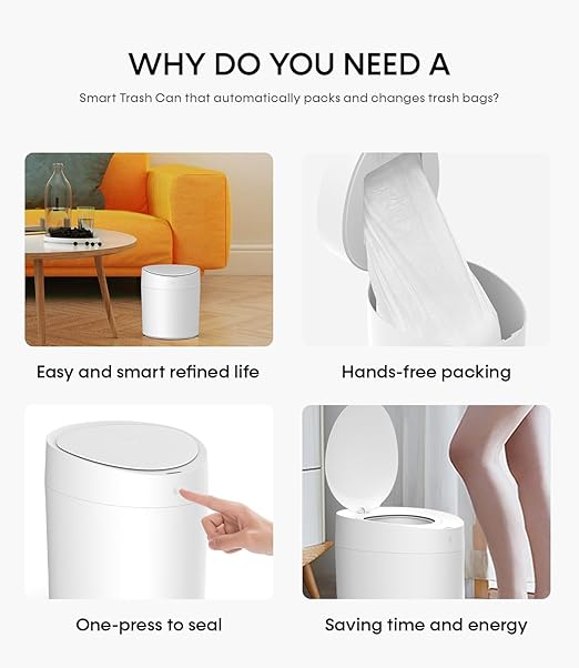 - Self-Sealing and Changing in One-Touch: Just press and hold the touch button of the automatic trash can for 3 seconds to achieve one-click automatic packaging. After packaging, press main lid button after hearing the beep sound. After the lid is automatically bounced, take out the trash bag and turn off the lid manually to automatically change a new trash bag.
