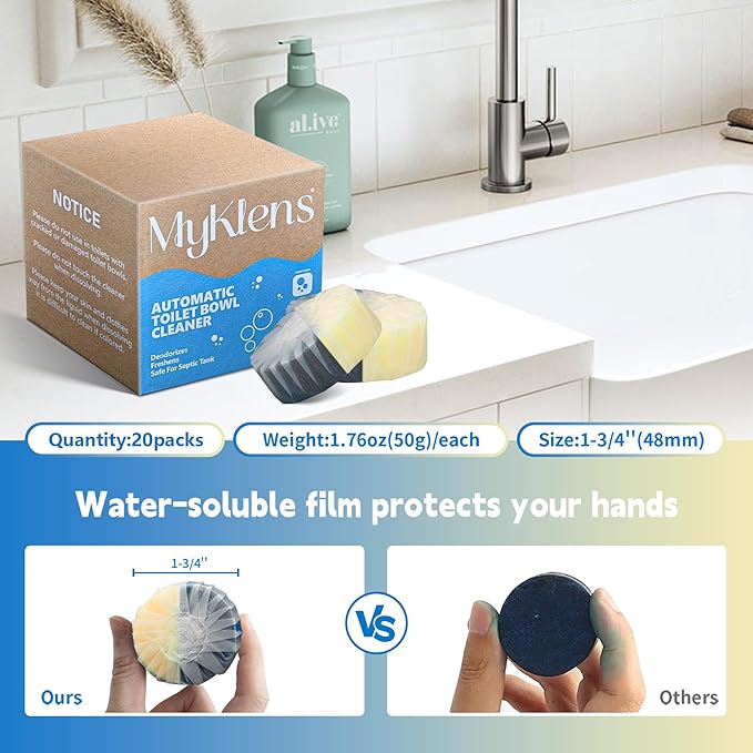 - Long-Lasting Life: Each automatic toilet bowl cleaner tablets can continuously the toilet for up to 15 days (Even 20 days) with 20 flushes a day. With 6-12-20-40 packs for choice. MyKlens toilet bowl cleaner can keep clean and fresh for over 3-20 months;