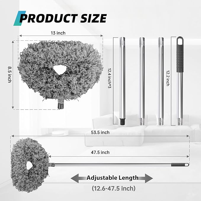 - [Adjustable Length] The ceiling fan cleaner is a four segment splicing product that can be freely adjusted in length. The extension pole can be adjusted to 13 to 48 inches, making it convenient to clean both low areas and high ceilings.