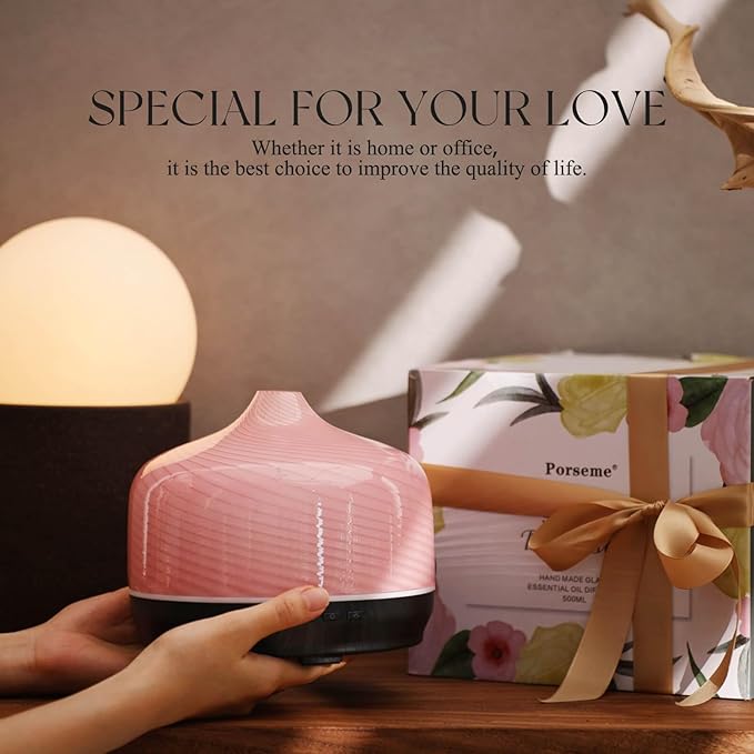 Porseme 500ml Glass Essential Oil Diffuser Aromatherapy Ultrasonic Cool Mist Humidifier 15-21 Running Hours Waterless Auto-Off Air Diffusers for Sleeping Yoga Office Working Spa and Rest (Pure Pink)