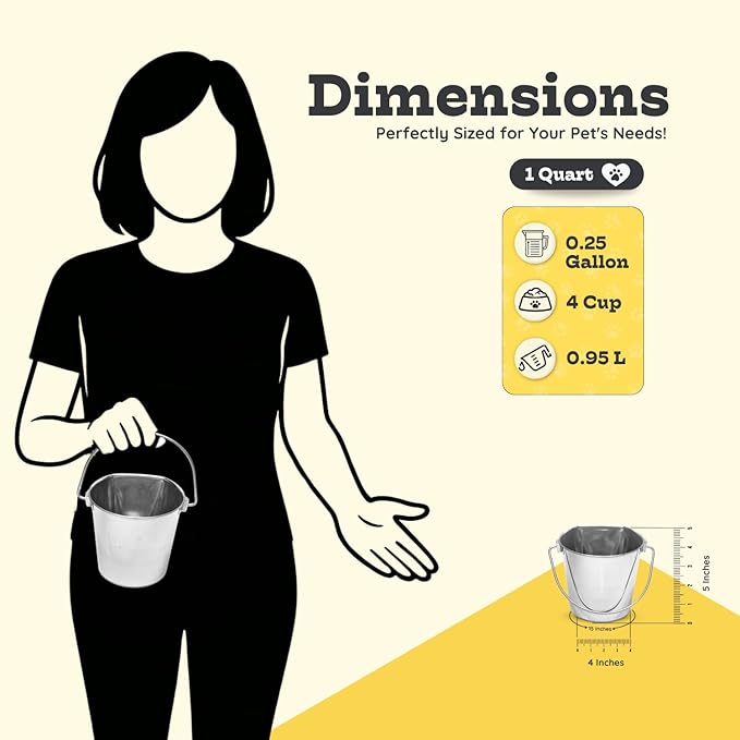 1 Quart Stainless Steel Flat Side Bucket | Durable Heavy Duty Food & Water Feeding Pails for Small Pet Dog Birds Cat | Fits kennels Cages Critter Crates Hanging Pail | Multipurpose Bucket
