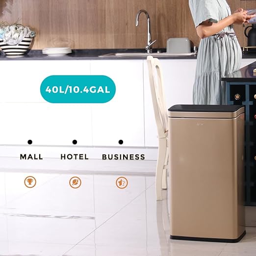 10.4 Gallon Large Metal Kitchen Garbage Can, Stainless Steel Trash Can, Open Top, Tall, Gold Wastebasket for Home Bathroom Hotel Lobby Office (40L Gold)