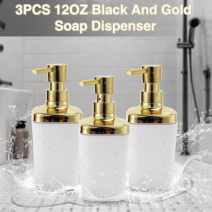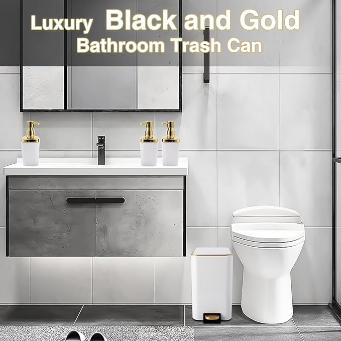 - [Package Included]:Trash can,3PCS Soap Dispenser,75 Count 5 Gallon Trash Bag,6 Waterproof Tags. each accessory is carefully selected to meet your daily needs.Our black and gold bathroom set is not only practical but also beautiful, making your bathroom space more neat and comfortable