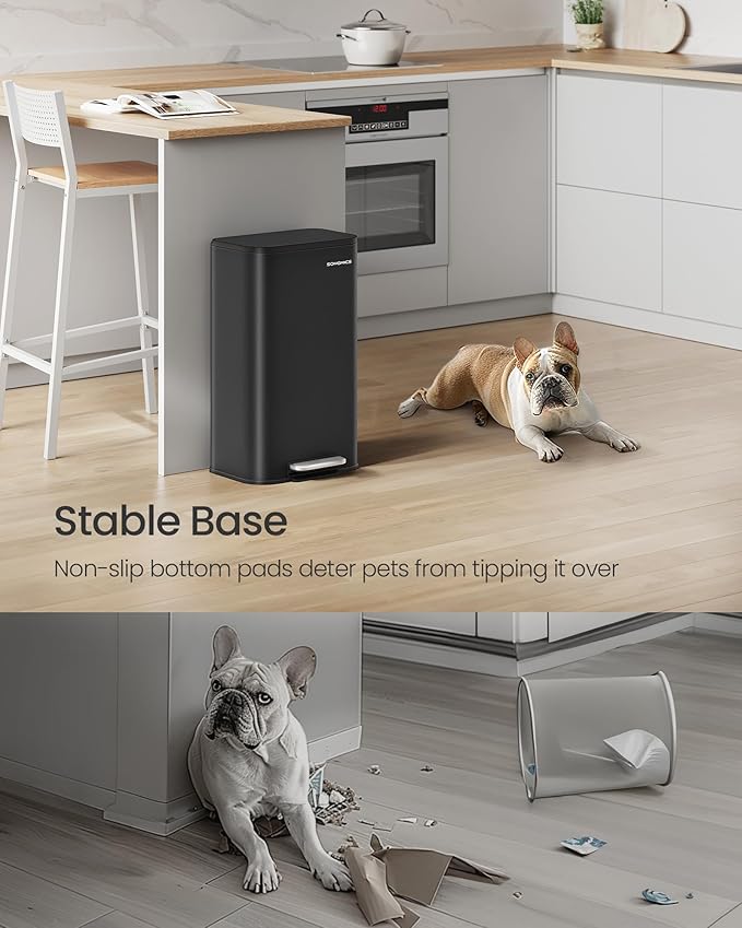 - [Durable and Stable] Made from robust stainless steel, this trash bin is resistant to rust, dirt, and is easy to clean. The base is equipped with non-slip pads to enhance stability, making it difficult for pets to tip it over