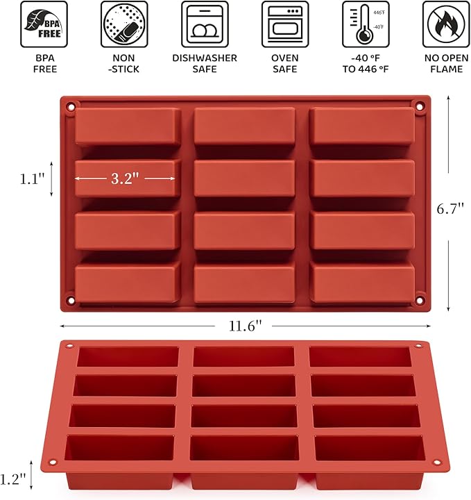 - Regular Shape: The 12 cavity silicone bar mold is 11.6 x 6.7 inch, and each cavity is 3.2 x 1.1 inch. The regular shape is suitable for baking various desserts