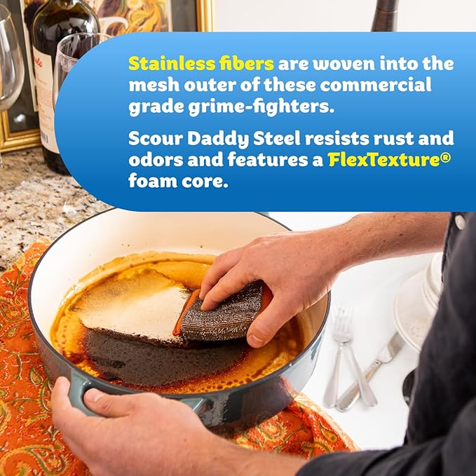 - Temperature Controlled - Scour Daddy Steel contains the same FlexTexture core found in our household cleaning sponges. The material becomes firm in cold water so it can scrub away heavy duty debris, and soft in warm water for light cleaning and wiping down surfaces.