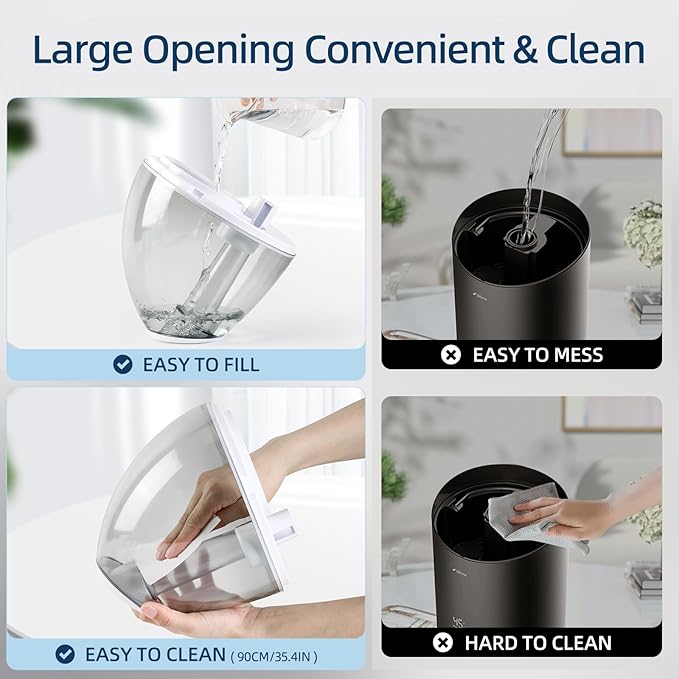 - Large Water Cover: The transparent 2L water tank of humidifier makes filling and cleaning a breeze.Large water cover, convenient for adding water, and holding a towel can directly clean the dirt inside the water tank.