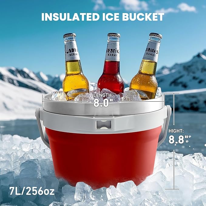 COKTIK 7L Vacuum Insulated Ice Bucket with Lid,Large Capacity Stainless Steel Beverage Bucket for Cocktail, Champagne, Wine, Beer,Large Parties(Red)