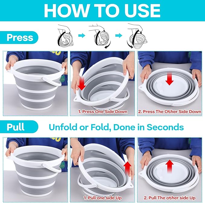 - Versatile Essential for Various Uses: Whether it's for RV,garden watering, drink cooler, car washing, camping, or fishing, ice buckets for parties, this 2-pack of collapsible buckets meets all your needs! Say goodbye to multiple containers; one set does it all, making daily chores and outdoor adventures more convenient.