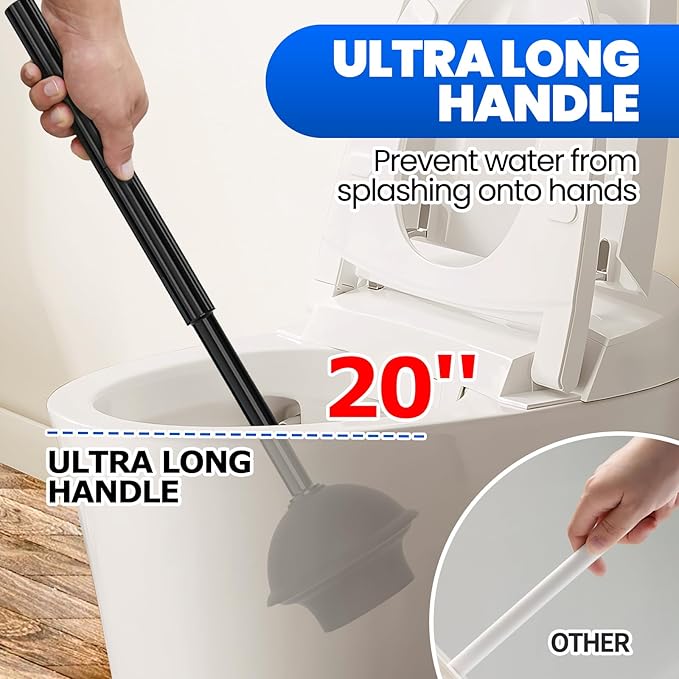 - Extended handle toilet plunger: Compared to regular handles, our upgraded extended handle prevents stains from splashing onto the hands. Powerful suction plunger solve various blockage problems.