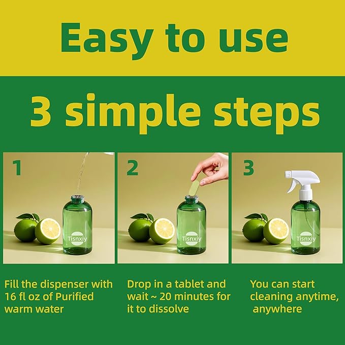 - Easy to Use: Our multi-surface cleaner tablet is a breeze. Simply drop a tablet into a spray bottle filled with water, wait for it to dissolve completely, and you're ready to tackle any cleaning task. The convenient tablet form makes storage and handling effortless, saving space in your cleaning cupboard too.