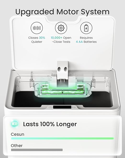 - 100% Longer Lifespan & Upgraded Smooth Closing: With an upgraded motor system, the lid of this automatic trash can glides shut like a whisper 10,000+ times.Light comes on when the lid is open. When your hand leaves the sensing area of the bathroom trash can with lid , the green light begins to flash for 5 seconds and automatically turns off