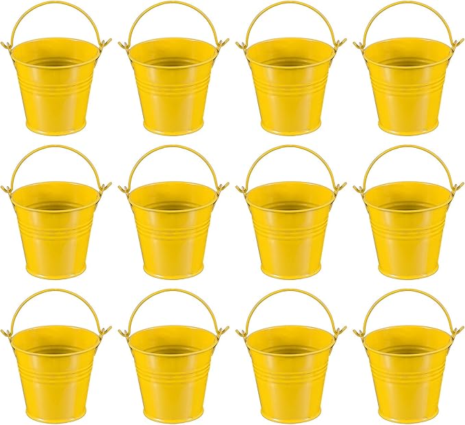 - Color: Yellow; Material: Metal; Overall Dimensions: 7 x 5 x 6 cm / 2.7 x 1.9 x 2.3 inch (Top Dia*Bottom Dia*Height); Packing List: 12 Pcs x Mini Colored Metal Buckets