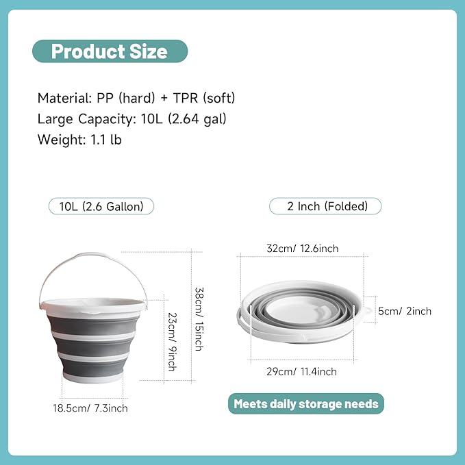 - Space-Saving and Easy to Store: With a size of 12.6(L) x 12.6(W) x 9(H) inches when expanded, it folds down to just 1.9 inches high, saving over 70% of storage space. Whether in your car, home, or during camping, it can be easily stored, solving the space issue that traditional buckets often cause