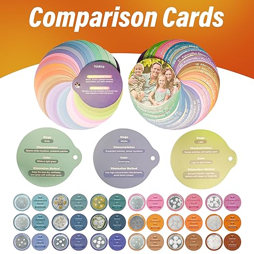 - Visual Mold Growth Comparison Cards for Clear Detection Our QOOMABA Mold Test Kit includes unique visual comparison cards showing mold growth stages (early, middle, and late). These cards help you identify and compare mold types easily. With vivid, high-quality images and distinctive colors, they ensure accurate mold detection for black mold and indoor allergen testing, making it perfect for air mold test kits and air quality tests in your home.