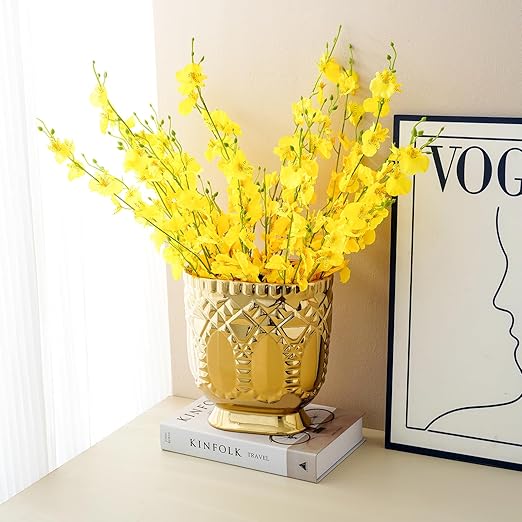Modern Golden Trash Can, Ceramic Waste Container Garbage Receptacle Bin for Bathrooms, Powder Rooms, Kitchens - Stylish Wastebasket Garbage Can for Home & Office