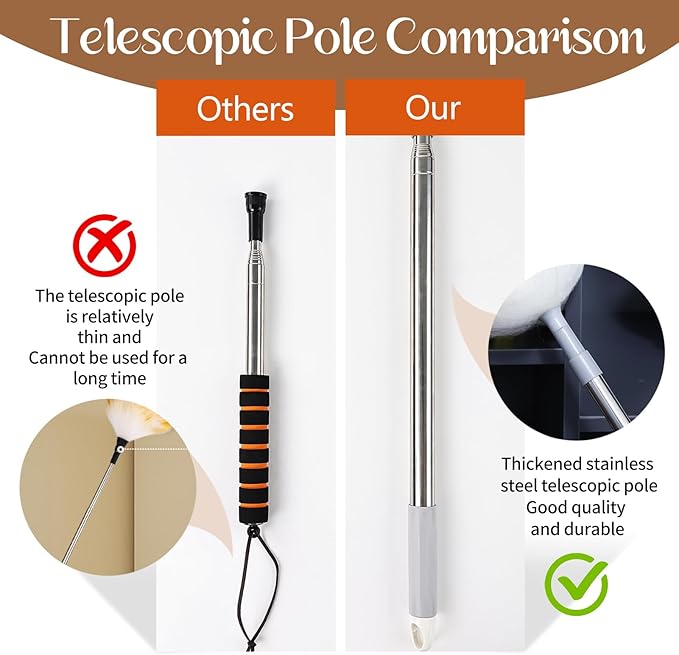 - HIGH QUALITY LAMBWOOLS FEATHER DUSTER: Stainless steel telescopic pole design easily sweeps away dust from high places, making roof cleaning simple! Screw-type detachable design, easy to connect, longer service life, easy to store and save space