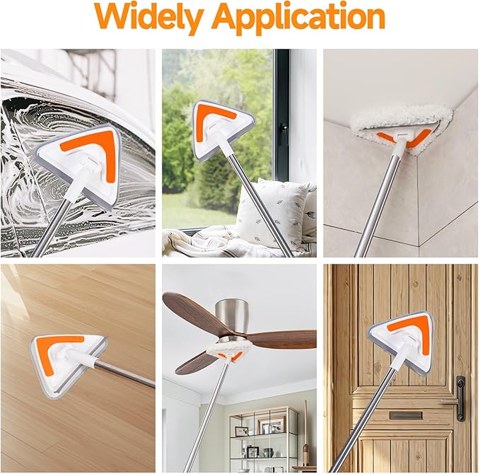 - Flexible Triangle Mop Head:Our triangle mop head features a 180°rotation, allowing you to bend it to any angle and clean those hard-to-reach areas like corners and under furniture,effectively cleaning dust, pet hair, and spider web from your floors and ceiling.Create a cleaner, healthier home for you and your family.