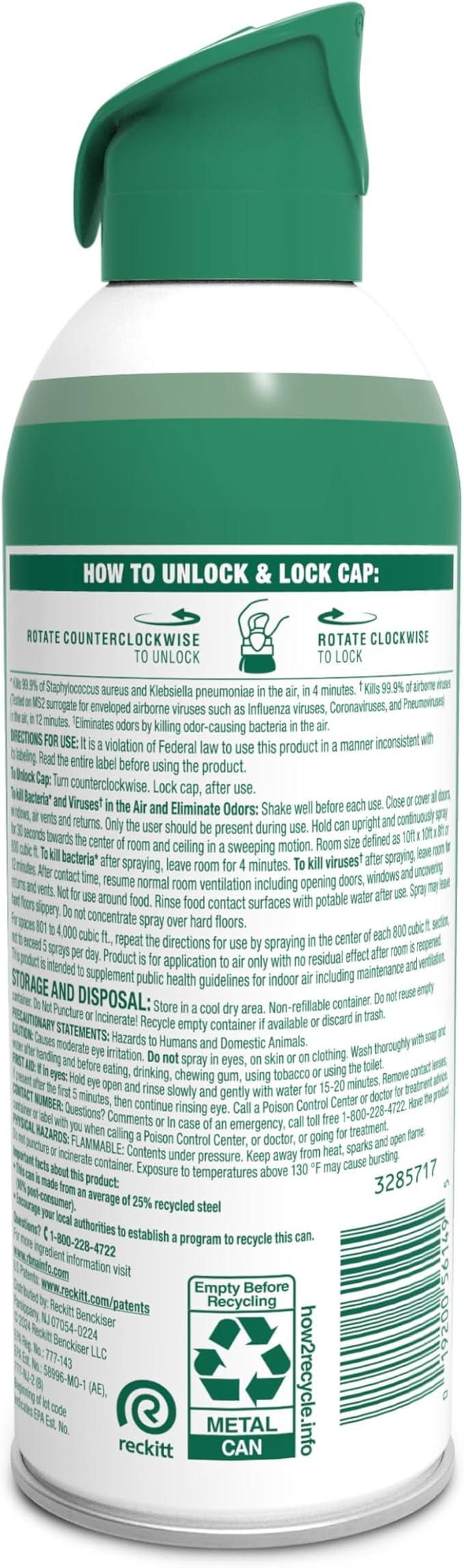 - ELMINATES 99.9% OF VIRUSES AND BACTERIA IN THE AIR: Lysol Air Sanitizer Spray is tested and proven to eliminate 99.9% of viruses and bacteria* in the air. (*Use as directed); EPA Reg No. 777-143.