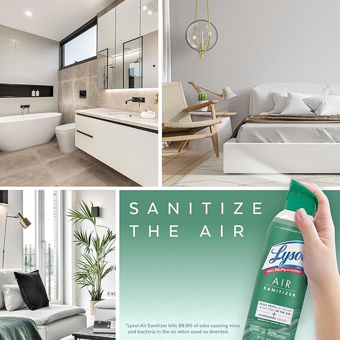 - SANITIZE THE AIR THROUGHOUT YOUR HOME: Lysol Air Sanitizer Spray sanitizes and eliminates 99.9% of odor causing bacteria* in the air. Enjoy the mountain spring scent. (*Use as directed).