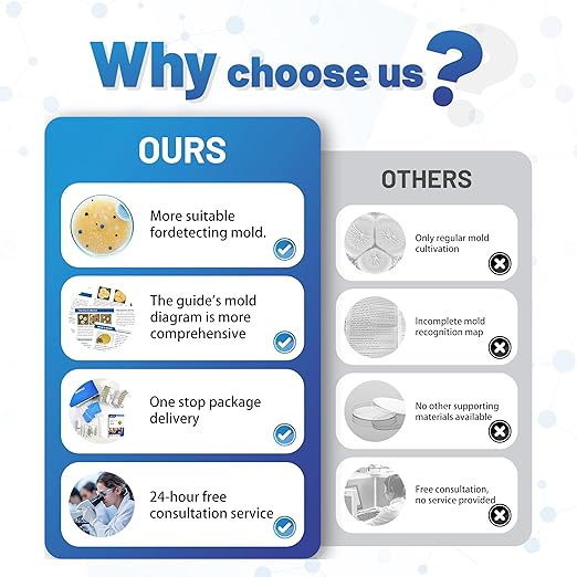 - Fast and Reliable Mold Detection - This mold test kit for home includes a mold identification guide, delivering quick and reliable results. Easily identify and understand the type of mold present in your home, enabling prompt action. We also offer free laboratory analysis—simply send us photos of the mold, and our team will analyze it for you 24/7