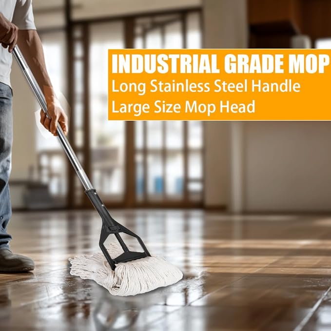 - 【Premium Long Handle】The handle of the industrial mop is made of thickened stainless steel, with high-quality coating, rust-proof, wear-resistant, non-slip and sturdy.The 60 inch long mop allows you to stand upright for cleaning, reducing the strain on your waist.