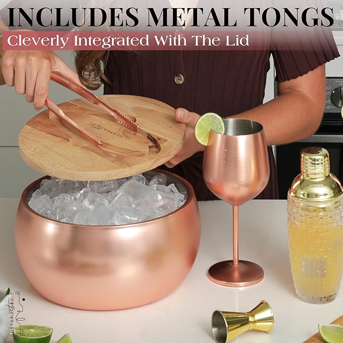 - QUALITY THAT MATTERS Stainless steel large insulated ice bucket with wooden lid and tong crafted for durability and optimal insulation, BPA-free ice bucket for bar with comfortable and ergonomic design that makes it perfect for parties and gatherings