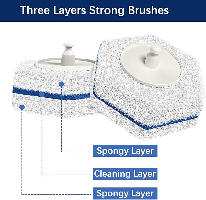 - Triple-Layer for Clean & Protection - Top abrasive fibers scrub grime; Core concentrated foam breaks down 99% stains; Splash-proof base traps dirty water. One-touch release drops used heads into trash.