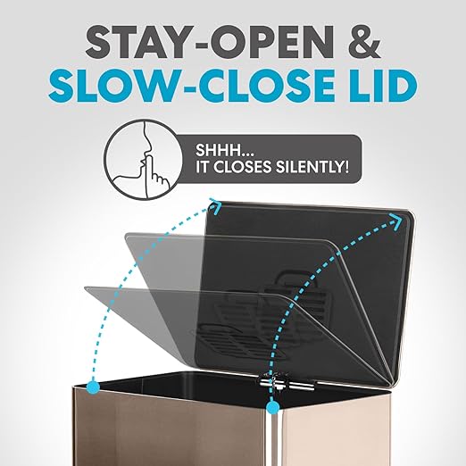 - Quiet-Close Lid: Lid closes quietly and gently without slamming. Hands Free and Fingerprint Proof: Hands-free operation with durable a metal foot pedal and fingerprint-resistant stainless steel finish leads to your trash can staying cleaner longer
