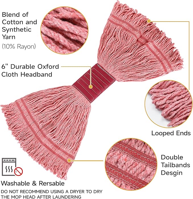 - Desiged For Function:Using 6'' oxford cloth headband with 10 sturdy stitching lines ,ensures that the mop remains durable and resilient after frequent use and rigorous cleaning.Looped ends and double tailband desgin prevent yarn from scattering,reduces fraying and linting and provide wide surface span and even coverage.