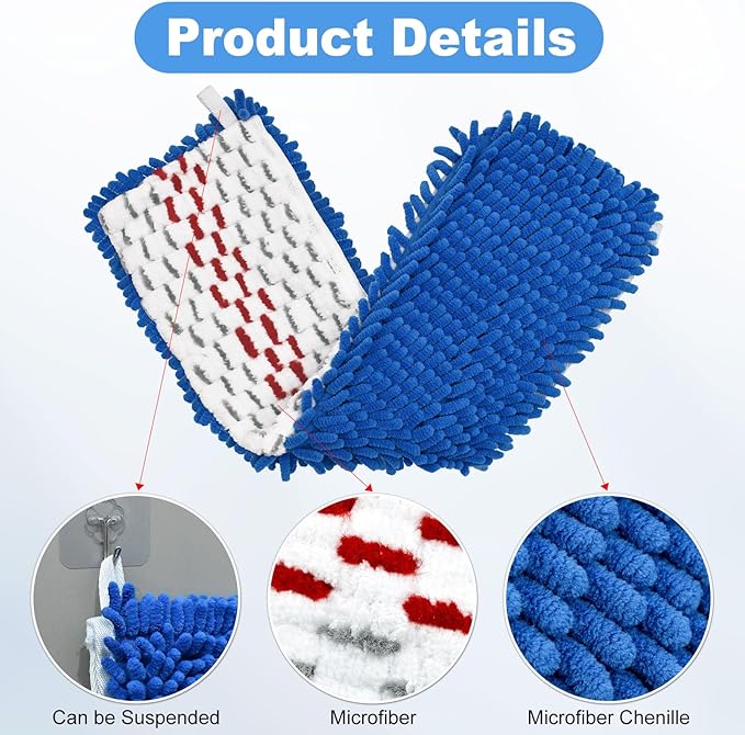 - Wet & Dry Use Mop Replacement Heads: The dual action flip mop replacement heads are double-sided, featuring both chenille and microfiber sides. The chenille fabric side offers a strong cleaning ability for dry dusting, effortlessly absorbing dust and others. The microfiber side, equipped with scrub strips, absorbs water and deep-cleaning tough dirt and stains.