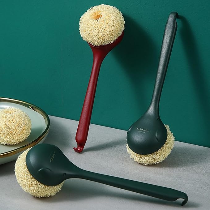 - ERGONOMIC DESIGN: Long-handled dish scrubber features a comfortable grip and extended reach, perfect for cleaning dishes, pots, and pans while keeping hands away from hot water.12-inch total length with a 3-inch diameter scrubbing head provides optimal reach and cleaning coverage for most kitchen tasks