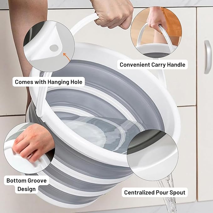 - [ COLLAPSIBLE & SPACE-SAVING DESIGN ]: Innovative fold-flat design compresses the bucket down to just a few inches in height, making it ideal for storing in kitchen drawers, RVs, camping bins, or small closets when not in use.