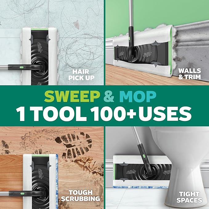 - The Swiffer Sweep and Mop Deluxe is a 2-in-1 Floor cleaning tool for sweeping and mopping. Features a collapsible pole for easy storage and reinforced pole for tough scrubbing. The locking head allows for easy cleaning of baseboards and tight spaces.