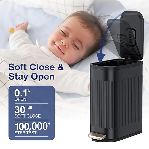 - Soft Close & Stay Open Lid:The stainless steel trash can is made of a stay open function and pushes the lid at 90° when release the pedal.The soft close lid has a great feature—it closes quietly and smoothly.