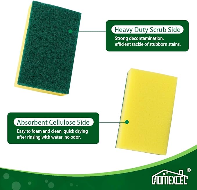 - Heavy Duty Sponges: The scrub sponges can remove grease and dirt from pot and pan; the yellow side of the absorbent sponge is gentle enough to clean glassware, while the green scrubbing side is strong enough to tackle the dirtiest tasks