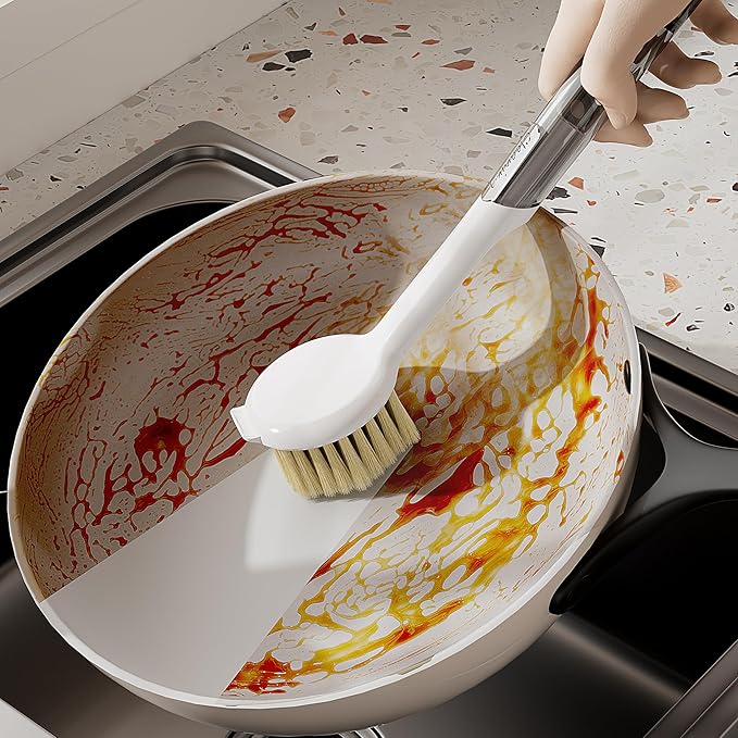 - Long Handle Design: The extended handle provides a comfortable grip and allows you to reach deep into pots and pans for thorough cleaning.