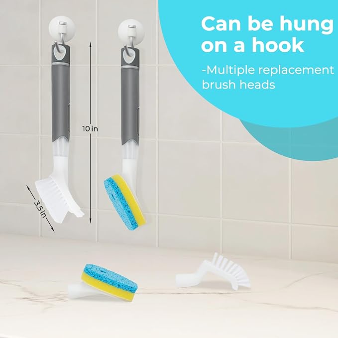- Soap Dispensing Dish Brush Storage Set:Dish scrubber brush is equipped with two different material brush heads, it is easy to change the new brush head according to the usage, 1x dishwashing brush with handle, 2x durable sponge head, 2x high quality nylon bristle brush head. Safe for all dishes and cookware