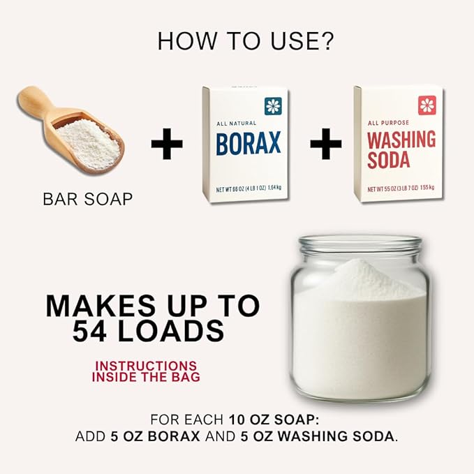 - ✔ EASY TO USE – JUST MIX & WASH Our 17.5 oz box of concentrated ground bar soap makes 54 loads when mixed with Borax and Washing Soda. Full instructions are included in the listing images and a printed instruction card is inside the bag for your convenience.